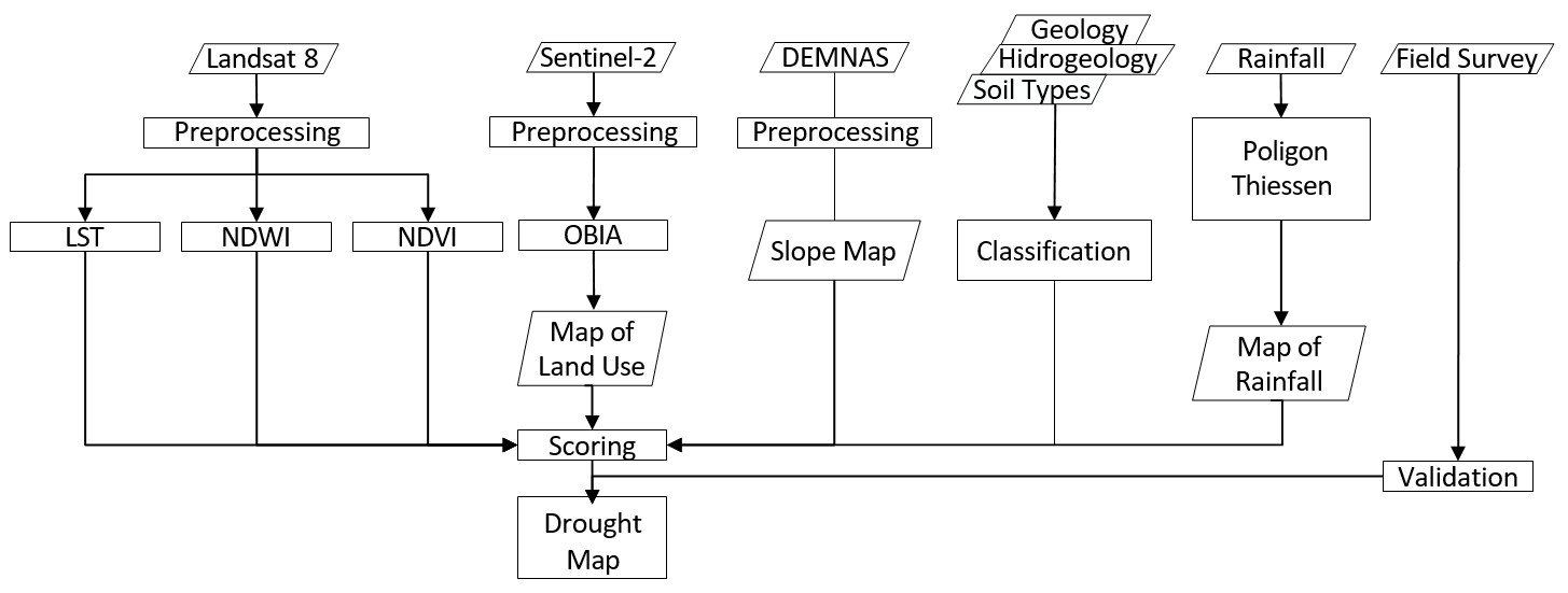OBIA is an alternative to extracting land use using a pixel-based method with the basic unit of analysis as the image object, not individual pixels (Blaschke et al., 2008). OBIA is a remote sensing data processing by combining Geographic Information (GI) (Hossain and Chen, 2019). Meanwhile, the Normalized Difference Water Index (NDVI) Transformation is one of the algorithms used to determine the relationship between potential droughts in an area. The NDWI algorithm is used to detect the humidity of an area because NDWI is very sensitive to changes in leaf moisture content due to the SWIR spectrum dominating the effect of water absorption on green vegetation (Sánchez-Ruiz et al., 2014). Land Surface Temperature (LST) algorithm is used to determine the distribution of surface temperature in the research area to be used to analyze the potential for drought. This study integrates remote sensing data and regional condition data to obtain areas with the potential for drought using a geographic information system (GIS).