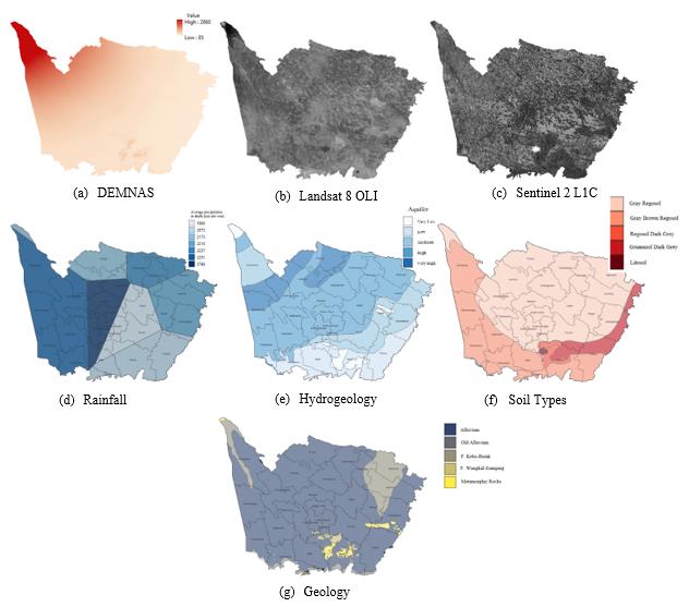 Figure 2 shows the flow of research carried out to identify drought in Klaten Regency. Meanwhile, the research data can be seen in Table 1 and Figure 3. Landsat 8 data were processed to obtain LST, NDWI, and NDVI values. Then, Citra Sentinel 2 produces a land use map from the results of OBIA processing. Slope Map obtained from DEMNAS. Regional condition data such as geology, hydrogeology, soil type, and map of rainfall data are classified for drought analysis. All data were scored to identify the drought disaster in Klaten Regency.