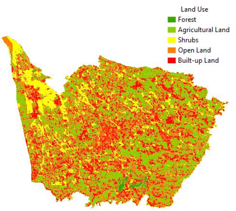 Inaccuracy in determining the value will result in the accuracy of land use classification. In this case, the value of the scale parameter is also greatly influenced by the resolution of the image used, so that the application of this value between satellite images can be different. The parameter value of this research scale uses a value of 60 with agricultural land class can be detected as the smallest object. The results of the segmentation are classified into land use classes that have been determined by selecting the training area in each class. The number of samples is determined proportionally in each class. The determination of the training area sample is influenced by the operator's knowledge of visually identifying the image so that it can affect the accuracy of the classification results. This study resulted in a land use classification of 5 classes including built-up land, open land, forest, agricultural land, and shrubs which can be seen in Table 2.