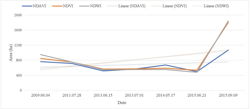In recent years, the floating vegetation of Lake Sevan has experienced significant changes due to various factors. Using the three different vegetation indices proposed in this report and the TM and OLI images to extract the annual distribution range of floating vegetation cover in the Lake Sevan from 2009 to 2015 (Figure 4), we analyzed the spatial distribution patterns and trends of floating vegetation. As demonstrated in the Figure 5, the floating vegetation above the water surface of Lake Sevan in case of all tree vegetation indices exhibited an overall trend of slowly from decline 2009 to 2013. A slight decrease in AW in Lake Sevan can be associated with an intensive increase in the lake level over the period 2007-2013. However, after that, the trend changes slightly.