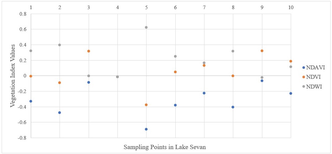 Vegetation Indices values were selected from 10 random points from areas away from the coastal zone (where the concentration of floating vegetation is mainly observed) of lake Sevan to compare the ability of different floating vegetation indices to distinguish floating vegetation during algal blooms. Among the floating vegetation indices, it can be seen from the chart (Figure 7) that NDAVI, NDVI, and NDWI have significant differences between distribution of the values.