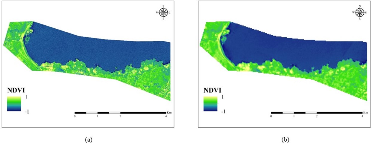Figure 8: The Comparison of NDVI Maps of the North-Western Shore of Lake Sevan: (a) GeoEye-1 (b) Landsat OLI