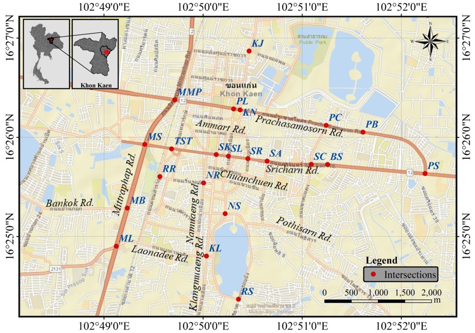 Furthermore, the coordinates for 23 intersection points within the research area were obtained from Google Maps at https://www.google.com/maps/. These intersections, which were analyzed in the study, are detailed in Table 1. Additionally, the locations of the 23 intersections depicts in Figure 2.