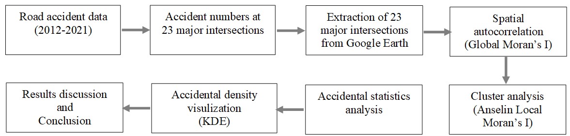 For instance, least squares and spatial analysis techniques were utilized to investigate the impact of road intersection geometry, traffic volume, and traffic light waiting times on road accidents, high-risk areas at junctions within the study area were successfully identified from such techniques [7]. Similarly, Getis Ord Gi* was adopted to analyze hotspots of road accident in Selangor, Malaysia, the relationship between road geometries and accident-prone areas, with T-intersections emerging as the most frequent accident sites [8] Furthermore, in Nakhon Pathom, Thailand, cluster analysis techniques, kernel density estimation (KDE), and spatial autocorrelation analysis were utilized to pinpoint hotspots of highway accidents witin the study area, the results reveal a prevalence of high-risk areas along major roads characterized by heavy traffic flow and dense concentrations of population [9].