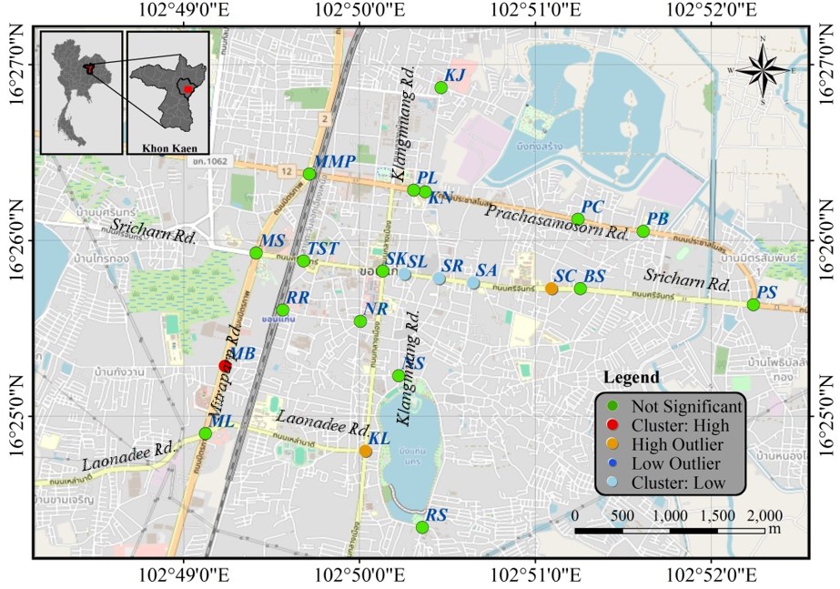 This research paper presents a comprehensive analysis of accidents at 23 intersections within Muang Khon Kaen district over the period from 2012 to 2021. The 10 years data were collected and analyzed utilizing Global Moran’s I to investigate the existence of spatial autocorrelation among the intersections. And Anselin Local Moran’s I was adopted to identify the cluster of the accidents at the intersections. The result found that the spatial pattern did not exist, which indicates that the accident numbers at each intersection is independent from each other. However, a hotspots and high outliers were found at Mitraparp-Bankok (MB) and Sricharn-Chatapadoong (SC) intersections, respectively, in 2020. The study identifies 2018 as the year with the highest incidence of accidents, followed by a notable decline post-2018, potentially influenced by the onset of the COVID-19 pandemic in early 2020. The analysis of accident hotspots reveals the Sricharn-Chatapadoong (SC) intersection as the most accident-prone location, contrasting starkly with the absence of incidents at the Prachasamosorn-Bakham (PB) and Robbueng-Srithat (RS) intersections. The MB intersection ranks second in accidents, consistent with hotspot identification in cluster analysis. Additionally, intersections ML and MS tie for third place in accident frequency. Temporal analysis uncovers a peak in accidents between 2:00 AM and 4:00 AM, likely attributable to driving under the influence (DUI) compounded by the closure of entertainment venues nationwide at 2:00 AM. Accidents are predominantly observed among males aged 18 to 25 years, frequently involving motorcycles as their primary mode of transportation. The concentration of educational institutions along Sricharn road contributes to heavy traffic flow, particularly during peak hours, increasing the risk of accidents, notably among adolescent motorcycle commuters. Consequently, the SC intersection emerges as a high-risk area, necessitating intensified surveillance and accident prevention measures. In conclusion, this study offers valuable insights into road safety challenges within Muang Khon Kaen district, providing evidence-based recommendations to reduce accidents. Decision-makers and authorities can leverage this information to implement targeted interventions and enhance road safety measures, locally and beyond.