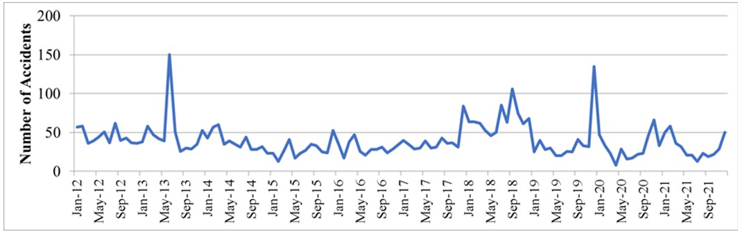 - To Identify Temporal Trends: Analyze the temporal patterns of road traffic accidents at major intersections in Khon Kaen Province over the period from 2012 to 2021, focusing on variations in the frequency and severity of accidents over time.