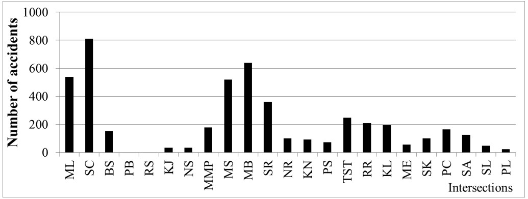 The accidents that occurred in Muang Khon Kaen district, Khon Kaen province, from 2012 to 2021depicts in Figures 5 and 6. Figure 5 provides an overview of the accident numbers, indicating an approximate monthly average of 40 incidents in the study area. Peaks occurred notably in March 2013 and January 2020. Moreover, 2018 stands out as a year with higher accident numbers compared to others. Figure 6 further dissects the annual accident data, corroborating the observation from Figure 5 that 2018 witnessed the highest incidence of accidents. The fluctuating nature of annual accident trends hampers detailed investigation; however, a decline in accidents is discernible post-2018, potentially influenced by the onset of the COVID-19 pandemic in early 2020. Notably, accident figures for 2020 and 2021 resembled those of 2015 and 2016, indicating a relative downturn compared to other years. Figure 7 illustrates that the Sricharn-Chatapadoong (SC) intersection had the highest accumulated accidents from 2012 to 2021. Conversely, no accidents occurred at the Prachasamosorn-Bakham (PB) and Robbueng-Srithat (RS) intersections during the same period.