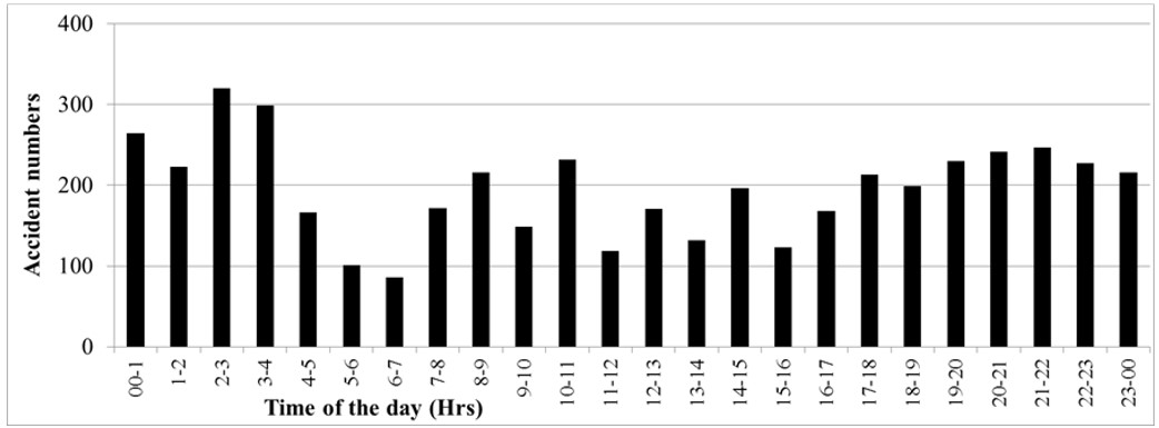 The time of accident and the accumulated accident numbers illustrates in Figure 8. the Figure reveals that the majority of accidents occur between 2:00 AM and 4:00 AM, with a significant decrease afterward, reaching the lowest numbers between 6:00 AM and 7:00 AM. This pattern is likely influenced by the closure of entertainment venues such as nightclubs at 2:00 AM nationwide in Thailand, suggesting a higher likelihood of accidents due to Driving Under the Influence (DUI) during this period [25]. Accidents during the hours of 7:00 AM to 3:00 PM are scattered. However, after 3:00 PM, there is a gradual increase in accidents until 10:00 PM, followed by a slight decrease until 11:00 PM, and then a sharp increase from midnight to 1:00 AM. The accident numbers decrease between 1:00 AM and 2:00 AM to a level similar to that observed between 11:00 PM and midnight. Thus, it can be inferred that accidents predominantly occur between 2:00 AM and 4:00 AM due to DUI behavior.