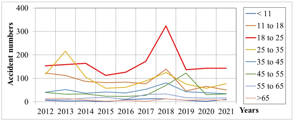 Figure 10: Age ranges and cumulative accident numbers from 2012 to 2021