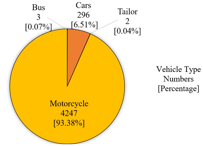 Figure 11 illustrates that motorcycles account for the majority of accidents, followed by cars, buses, and trailers, respectively. This aligns with the findings in the previous section, which indicated that the age range of 18-25 years old had the highest number of accidents. The following explanations elucidate the relationship between adolescents and accident numbers.