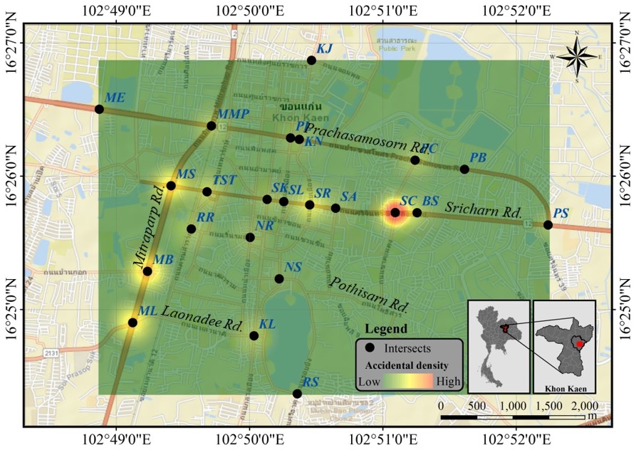 Road traffic accidents pose a significant public health and safety concern globally, with developing countries like Thailand experiencing a particularly high burden [4]. Despite efforts to improve road safety measures, Thailand continues to grapple with a concerning rate of accidents, especially at junctions. These intersections, where multiple streams of traffic converge, present complex traffic dynamics and a heightened risk of collisions. Thailand's road traffic accident situation reflects broader challenges associated with rapid urbanization, motorization, and infrastructure development [5]. The country's bustling urban centers, such as Khon Kaen Province, witness heavy traffic volumes and intricate road networks, amplifying the likelihood of accidents, particularly at junctions. Khon Kaen Province, situated in northeastern Thailand, serves as a microcosm of the nation's road safety concerns [6]. Its expanding urban areas, coupled with the interplay of various transportation modes, contribute to a dynamic traffic environment prone to accidents, especially at junctions. Investigating accidents at junctions is crucial for several reasons: