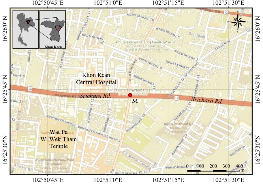 The Kernel Density Estimation (KDE) technique was employed to generate density representations of accidents across 23 intersections. Annual density surfaces of accidents at these intersections were generated individually. Subsequently, these 23 surfaces were combined using raster calculation tools. The overlaid KDE results are depicted in Figure 13. From the Figure, it is evident that Sricharn-Chatapadoong (SC) stands out as a focal point within the study area, as it exhibits a notably high density of accidents spanning a 10-year period. This observation aligns with the results of the cluster analysis, which also identified this intersection as a high outlier. Sricharn-Chatapadoong (SC) marks the convergence of National Highway no.12, known as "Sricharn" road, linking Muang Khon Kaen to Mahasarakham province, and Chatapadoog road, which connects Sricharn road to Prachasamosorn road, as depicted in Figure 14.