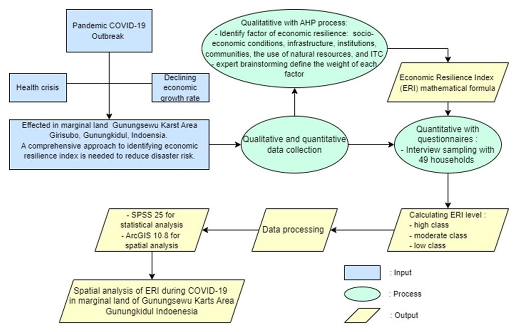 This study used a mixed methods research design, incorporating both quantitative and qualitative approaches. A qualitative approach was employed to explain the phenomenon in depth through in-depth interviews with experts and field surveys to document conditions. A quantitative approach was used for further data collection, employing questionnaires with closed questions related to the condition of economic resilience factors [24]. The research is divided into three main stages: input, process, and output. The first stage, input, involves developing economic resilience factors based on previous research through a literature review. Factors in economic resilience include socioeconomic conditions [25], infrastructure [26], the role of government /institutional factors [27] and [28], communities [27], the use of information and communication technology [29], and the use of natural resources [30]. The economic resilience factors developed in this study complement previous research that focused only on non-physical environmental factors. The factors used are more comprehensive, considering both physical and non-physical environmental conditions through a geographical approach. The second stage, the process, involves assessing AHP to obtain scores and weight factors through expert brainstorming. Experts selected for input are those working or conducting studies related to economic resilience in disaster conditions. Seven experts were selected from fields relevant to the research objective, such as geography, planning, health, government/policy making, and academia. Data were then collected through closed-question questionnaires in Girisubo, Gunungkidul using interview techniques. The data were processed statistically using Statistical Product and Service Solution (SPSS) 25 software and spatial analysis was conducted using ArcGIS 10.8 software to obtain a distribution map of the community's economic resilience index. The research output is a map of the economic resilience index during COVID-19 in the Marginal Land Gunungsewu Karst Area, Girisubo District, Gunungkidul Regency, Indonesia. The research flow is illustrated in Figure 2.
