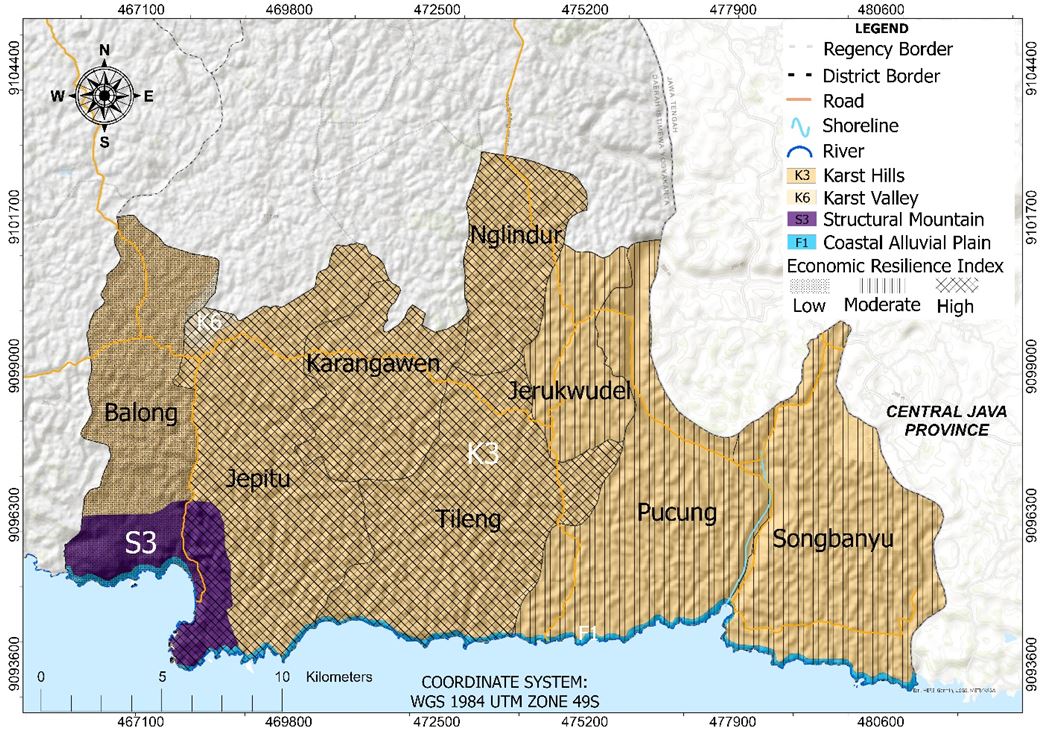 Figure 4: Distribution of the economic resilience index overlaid with the landforms of the Girisubo Area, Gunungkidul Regency, Yogyakarta, Indonesia