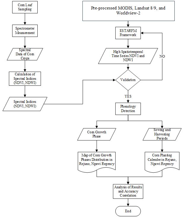 Following the workflow that can be seen in Figure 2, this study used MODIS Nadir BRDF-Adjusted Reflectance (NBAR; MCD43A4; https://developers.google.com/earth-engine/datasets/catalog/MODIS_061_MCD43A4) satellite image data at 500 m resolution and Landsat 8-9 Surface Reflectance Collection 2 Tier 1 satellite images to analyze the growth of corn plants in the study area. Image data were obtained from the Google Earth Engine platform ( https://earthengine.google.com/") at acquisition times from April 2013 to June 2023. MODIS-MCD43A4 was selected due to its daily acquisition frequency and the nadir and atmospheric corrections performed [11], despite its low resolution (500 meters). Meanwhile, Landsat 8-9 Surface Reflectance Collection 2 Tier 1 was chosen because of its good spatial resolution (30 meters) and atmospheric correction [12] but low temporal resolution (16 days). The ESTARFM method was used to perform image fusion to produce better spatiotemporal images to utilize its advantages. In addition, Worldview-2 satellite imagery was used for land classification of corn, sugarcane, and others. The data was acquired on May 25, 2023. This study also used vector data of administrative boundaries of Ngawi Regency obtained from the Geospatial Information Agency (BIG), while hamlet boundaries in Rejuno Village, Karangjati Subdistrict, Ngawi Regency were obtained from the Central Bureau of Statistics (BPS) to determine the study area. Spectral data of corn samples of three varieties (NK-Perkasa, NK-212, NK-Sableng, and NK-Sumo) were obtained through spectrometer measurements in Rejuno Village, Ngawi Regency, and processed to obtain validation values of spectral indices (NDVI and NDWI). Corn planting realization data from Ngawi Regency Food Security and Agriculture Office validated corn planting patterns in Ngawi Regency. This study used Google Earth Engine (GEE), Spyder, and ArcGIS software for data analysis.