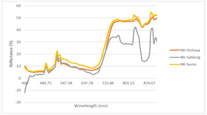 In this study, direct field measurements were made using the Ocean Optics Spectrometer to obtain reflectance values of corn plants. This value used to reference and validate the spectral index processing results of Landsat satellite imagery, MODIS, and ESTARFM image fusion. Corn varieties NK-Perkasa, NK-Sableng, and NK-Sumo were obtained in the late generative phase on the measurement date of February 2-5, 2023 in Rejuno Village.