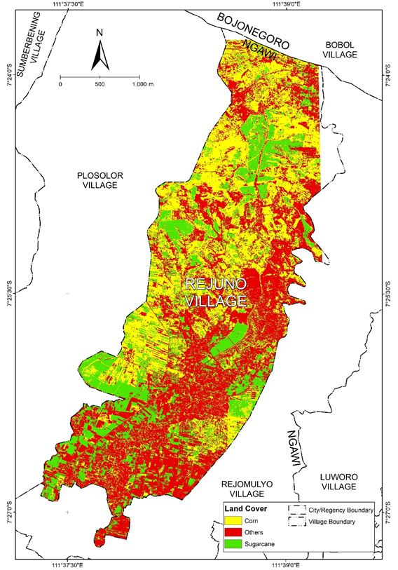 Rejuno Village is one of the villages in Karangjati District, Ngawi Regency, as shown in Figure 1. Geographically, Rejuno Village is located at 111°38'11.976"E and 7°26'9.46"S. Rejuno Village is located on the east-north side of Ngawi Regency and is characterized by hills. Rejuno Village is directly bordered by several areas, with the north side bordering Bojonegoro Regency, the west side with Plosolor Village, the east side, and the south side directly bordering Rejomulyo Village. Rejuno Village has an area of 1066.60 ha.