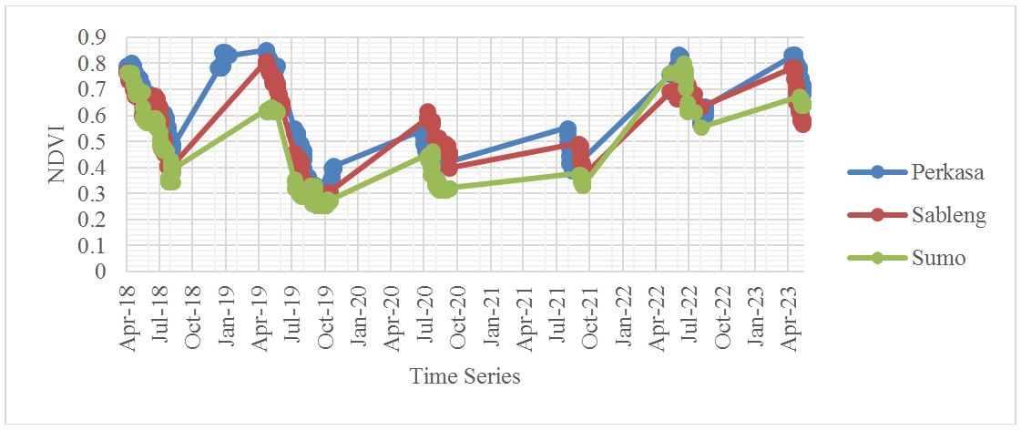 The determination of the growth stage of corn in this study was obtained by extracting NDVI and NDWI spectral index values using 3 ROIs with a size of 90 x 90 meters or equivalent to the size of 3x3 pixels of Landsat satellite images as sample points in corn fields of NK-Perkasa, NK-Sableng, and NK-Sumo varieties. This sampling was done to obtain values in areas processed by cloud masking on Landsat images. The extracted spectral index values were calculated as median values and determined in a time series graph from April 2013 to June 2023 to identify the growth stage of corn and determine the threshold value of the corn growth stage.
