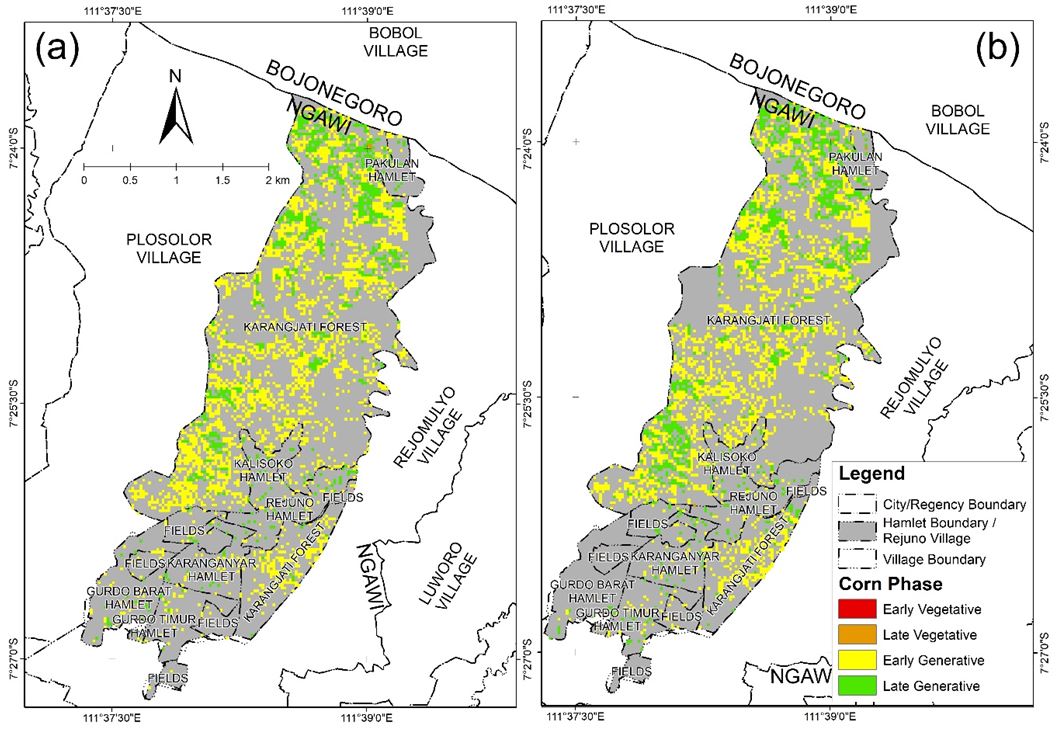 In May 2023, the most dominant phase was the late generative phase with an area of 236.43 ha based on Landsat imagery processing and 205.92 ha based on ESTARFM fusion imagery processing. This phase occurs throughout the study area and is most common in the Karangjati Forest. Other phases that were obtained were the early vegetative phase with an area of 1.17 ha based on Landsat imagery processing and 0.99 ha based on ESTARFM fusion imagery processing, the late vegetative phase with an area of 3.96 ha based on Landsat imagery processing and 2.97 ha based on ESTARFM fusion imagery processing, and the early generative phase with an area of 101.88 ha based on Landsat imagery processing and 79.38 ha based on ESTARFM fusion imagery processing. The difference between ESTARFM and Landsat in the term of area come from the flag (usually cloud flag) from Landsat and/or MODIS. The ESTARFM only produces clear pixels when no flag at the exact same pixel in MODIS or Landsat data.