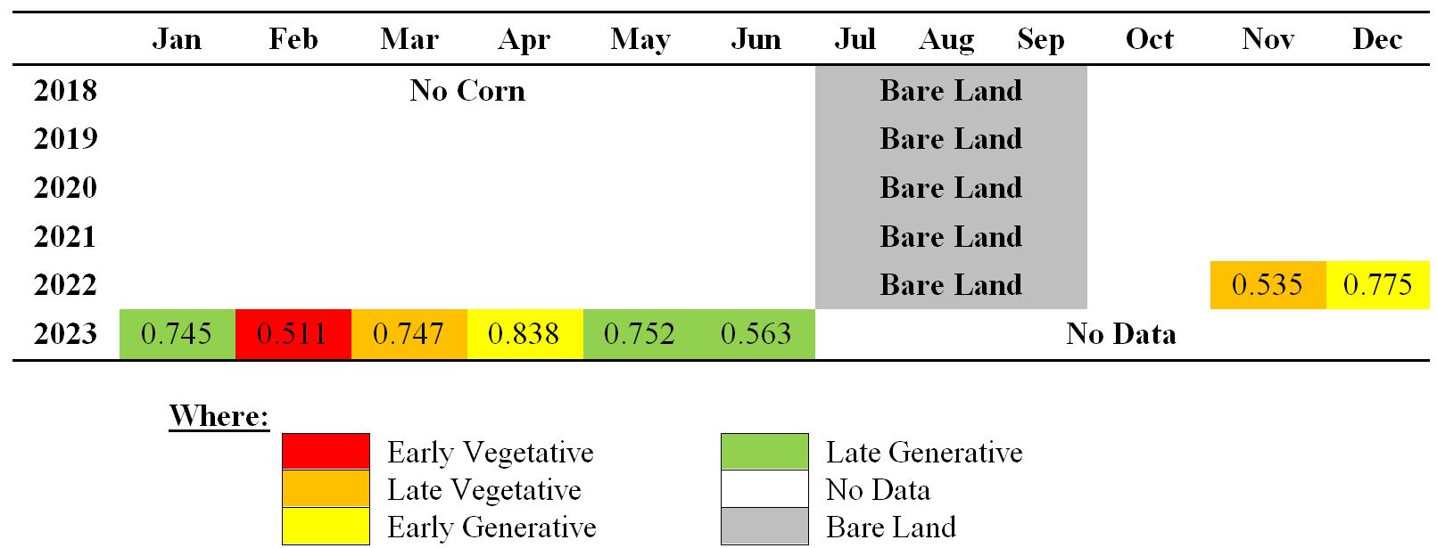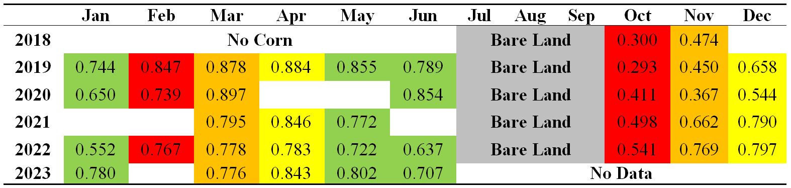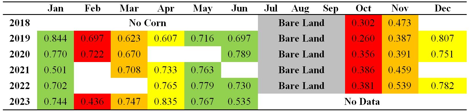 Table 8: Monthly median values of NDVI and corn phenology in the NK-Sumo's ROI for 2018-2023 using Landsat 8-9 imagery